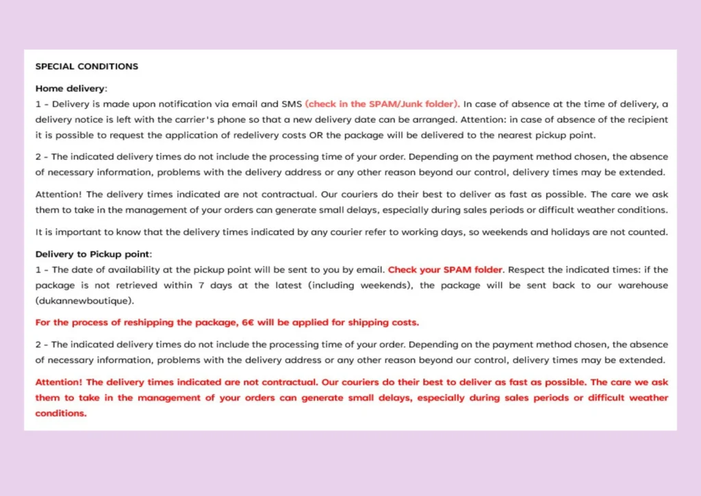 Per garantire una qualità ottimale della preparazione, dobbiamo effettuare un doppio controllo. Pertanto, ogni ordine effettuato prima delle 12.00 viene preparato il giorno stesso e spedito il giorno successivo. Gli ordini per il fine settimana vengono preparati il lunedì e spediti il martedì. Gli ordini effettuati nei giorni festivi vengono preparati il giorno lavorativo successivo e spediti il giorno seguente. Pertanto, i tempi di consegna indicati si riferiscono al giorno di spedizione e non al giorno dell’ordine…