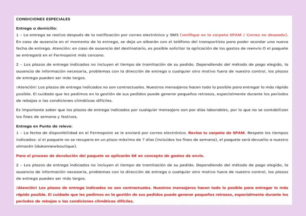 Para garantizar una calidad de preparación óptima, debemos realizar un doble control. Así, cualquier pedido realizado antes de las 12.00 horas se prepara el mismo día y se envía al día siguiente. Los pedidos de fin de semana se preparan el lunes y se envían el martes. Los pedidos realizados en días festivos se preparan el siguiente día laborable y se envían al día siguiente. Por lo tanto, los plazos de entrega indicados son a partir del día de expedición y no a partir del día del pedido…